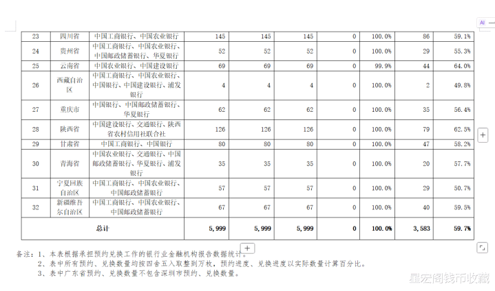 中国京剧艺术普通纪念币第3枚净角今天兑换进入到第6天,央行公布的兑换数据截止到11月27日24时已经兑换了3,583万枚,兑换率为59.7%。11月27号到今天也已经过去了三天时间,目前从各预约银行实时公布的兑换数据来推测,现阶段中国京剧艺术普通纪念币第3枚净角兑换率应该已经达到了85%~90%左右。