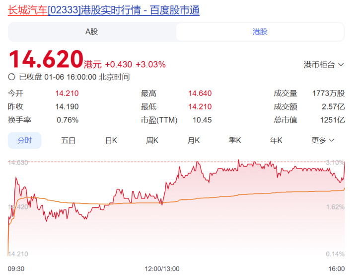 1月6日,长城汽车A股港股双双上涨,港股涨超3%。